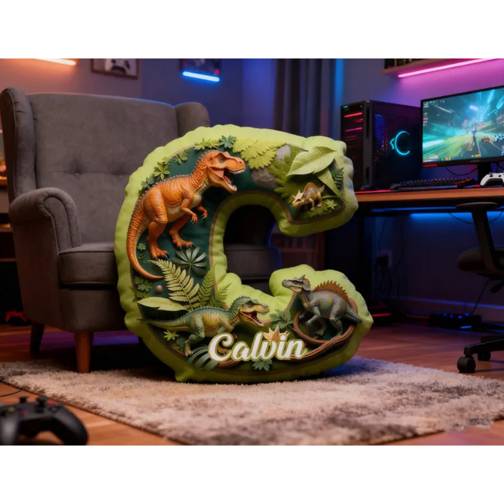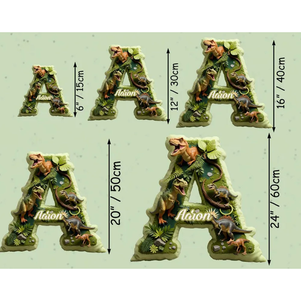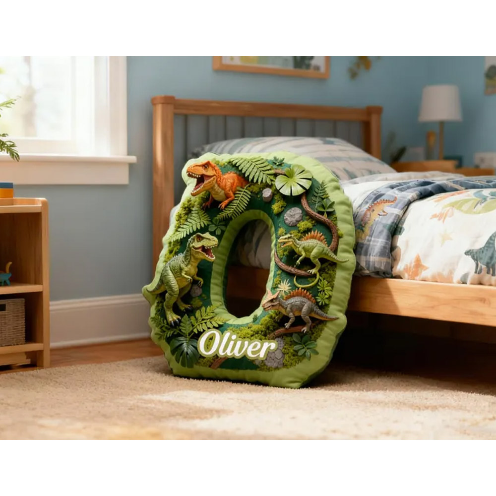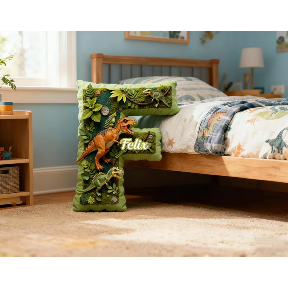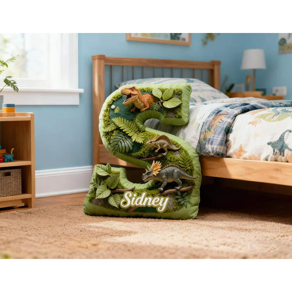 Dinosaur-Themed Alphabet Design – This plush pillow is shaped like a bold letter and features a vibrant jungle scene filled with lifelike 3D-style dinosaurs, including T. rex, Velociraptor, and Triceratops. The detailed design brings the prehistoric world to life, creating an eye-catching centerpiece that sparks imagination and joy.