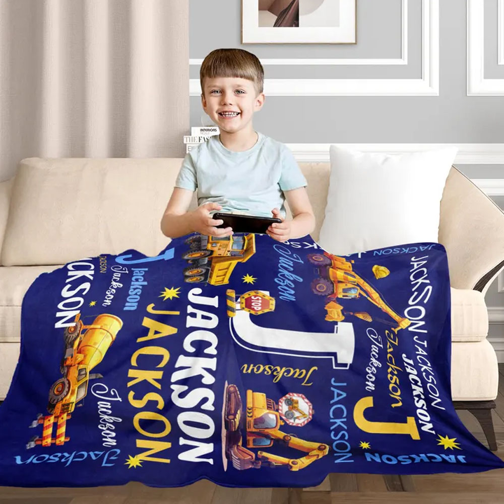 Personalized Initial & Name Construction Trucks Word Cloud Blanket, Flannel Soft Bed Couch Excavator Throw, Nursery Decor, Birthday Gift for Kids/Boys