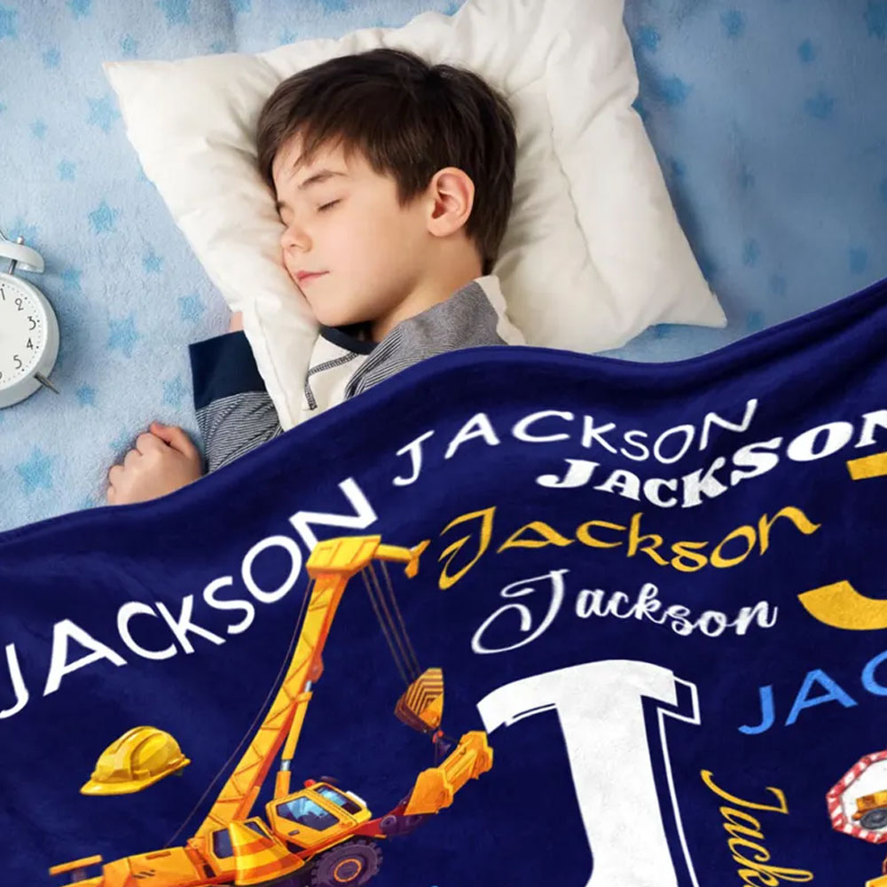 • Personalized Initial & Name Construction Trucks Word Cloud Blanket, Flannel Soft Bed Couch Excavator Throw, Nursery Decor, Birthday Gift for Kids/Boys