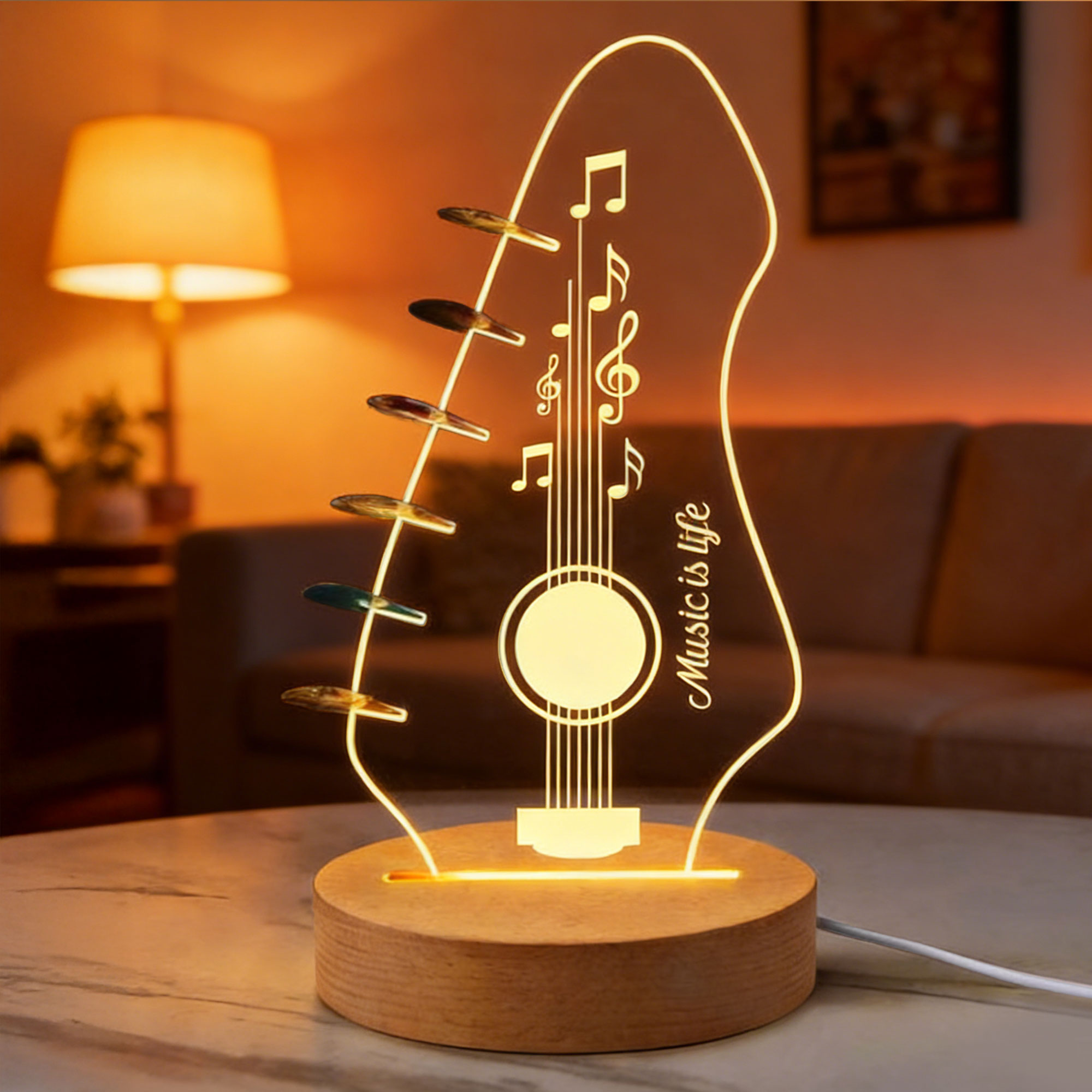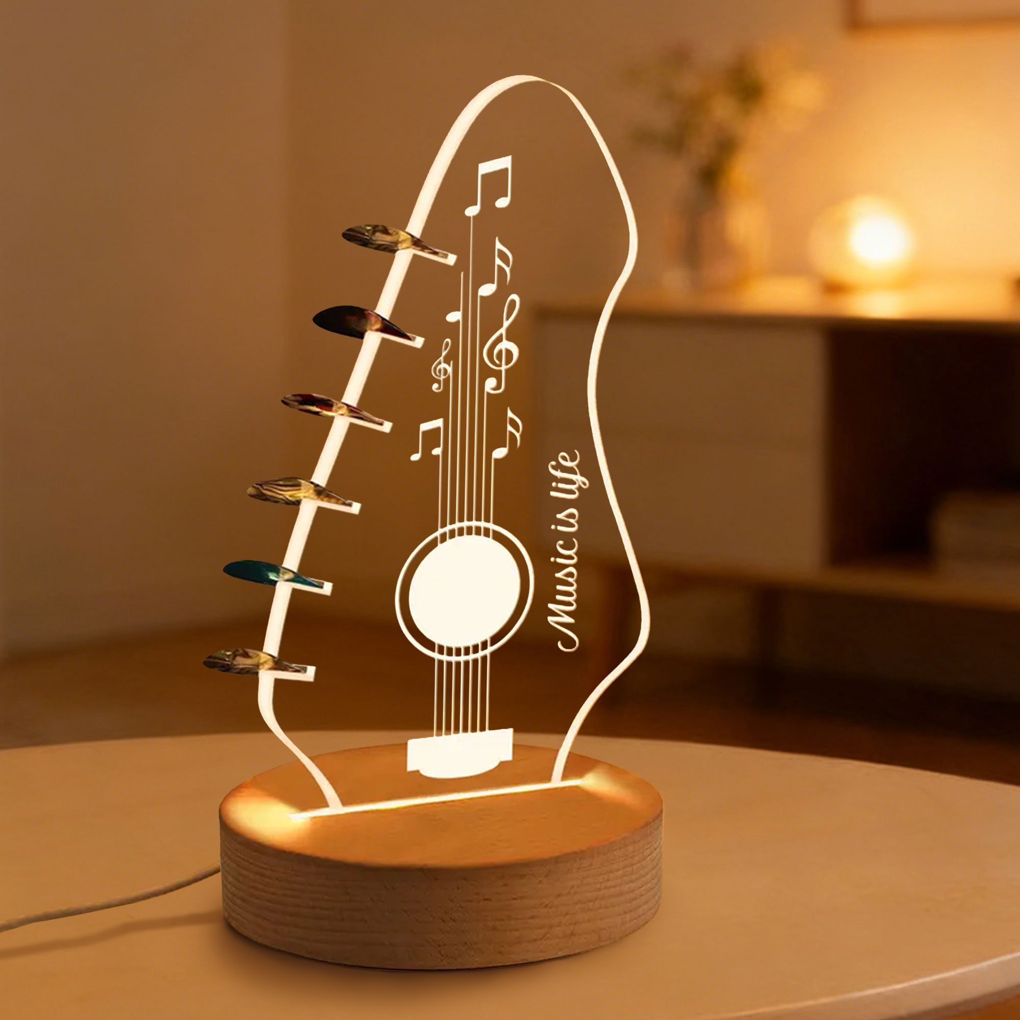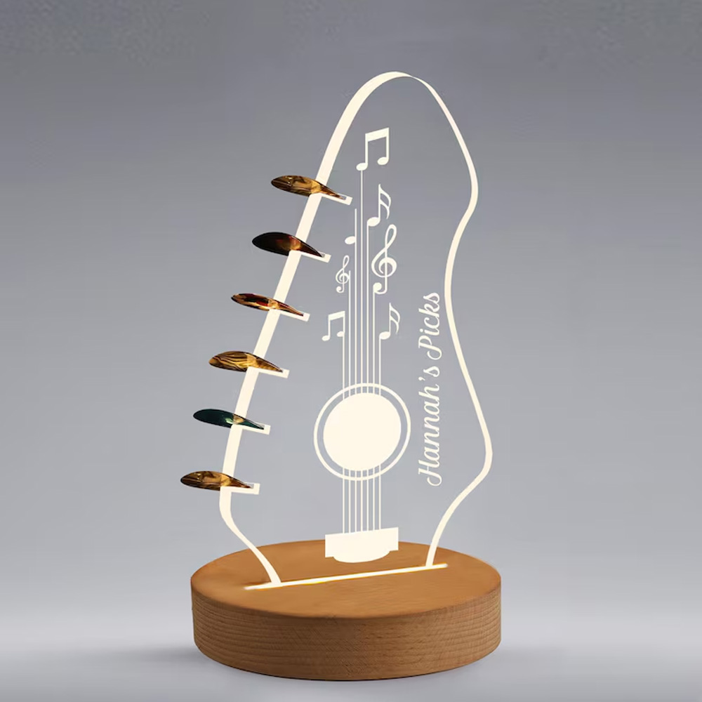 Guitar-Shaped LED Design – This elegant pick holder is shaped like an acoustic guitar headstock, crafted from transparent acrylic with a sleek silhouette. When lit, it glows softly with warm light, featuring musical notes, a sound hole, and the phrase etched along the body—creating a beautiful ambiance that celebrates the art of music.