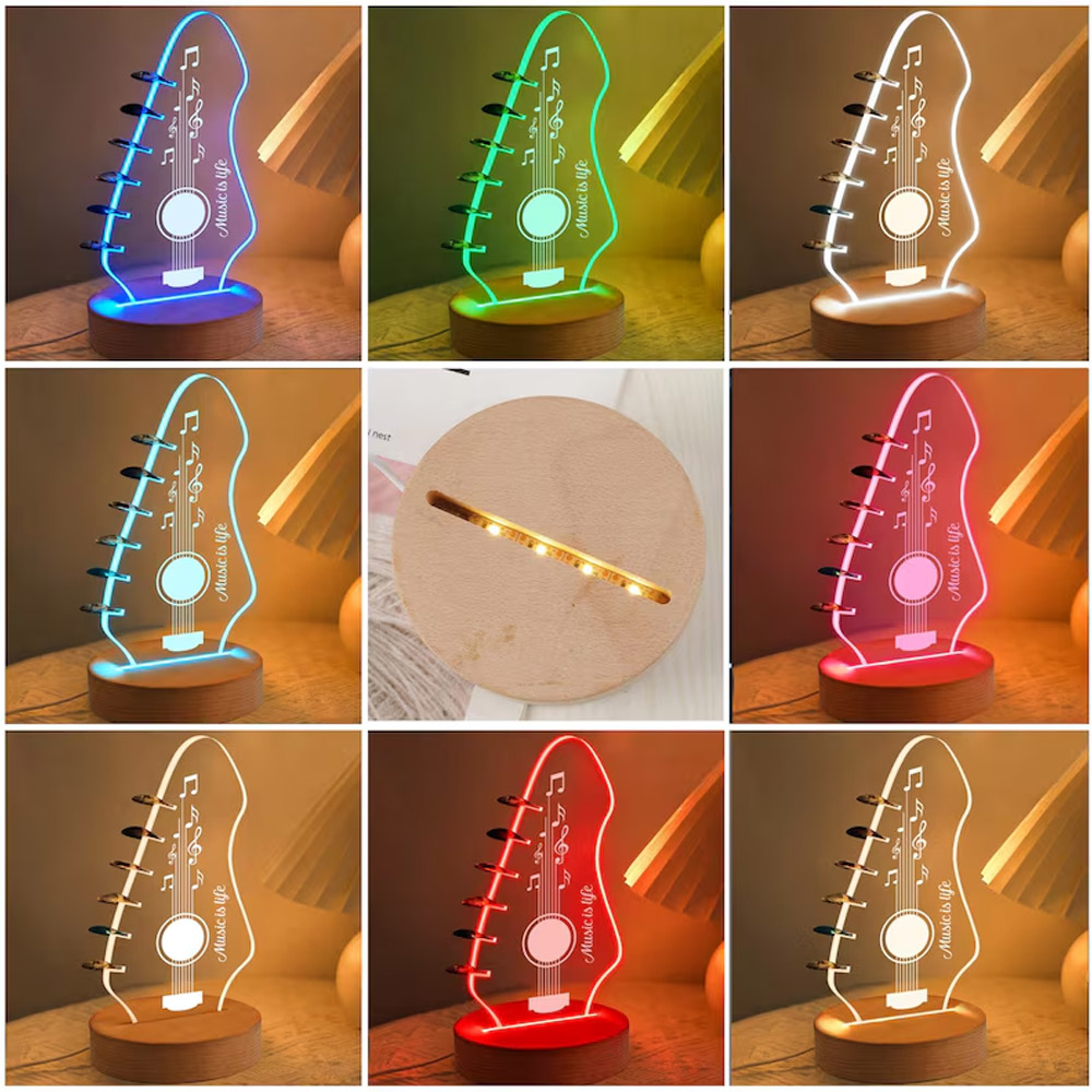 Customizable Name – Personalize the front of the guitar shape with your name in a stylish script. The name appears subtly illuminated when the light is on, adding a personal touch that makes this piece both functional and sentimental.